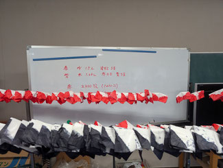 奥のホワイトボードに赤2,400枚、見えないですが青1,800枚染める予定が書いてあります。